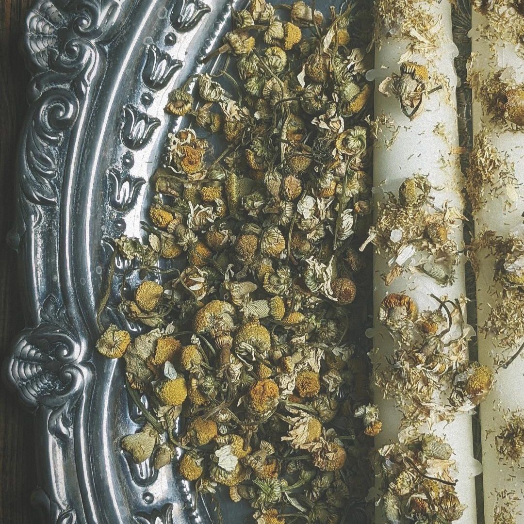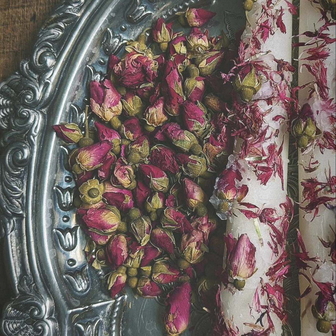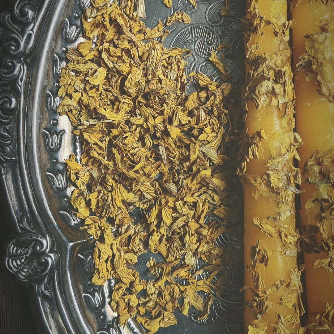To aid in ritual, manifestation and spellcrafting our hand-dipped taper candles are adorned with homegrown botanicals.